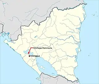 La península de Chiltepe con su forma redondeada se levanta en la costa sur del lago Xolotlán, a unos 15 kilómetros al noroeste de la ciudad capital.