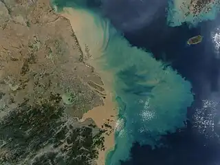 ![]() Costa de la provincia china de Jiangsu donde se aprecian los sedimentos aportados por los ríos Yantgsé y Amarillo. | ||