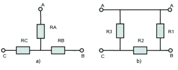 En la figura a) y b) pueden observarse respectivamente las asociaciones estrella y triángulo, también llamadas y o delta respectivamente. Este tipo de asociaciones son comunes en las cargas trifásicas. Las ecuaciones de equivalencia entre ambas asociaciones vienen dadas por el teorema de Kennelly: