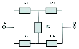 La determinación de la resistencia equivalente de este tipo de asociación tiene solo interés pedagógico. Para ello se sustituye bien una de las configuraciones en triángulo de la asociación, la R1-R2-R5 o la R3-R4-R5 por su equivalente en estrella, bien una de las configuraciones en estrella, la R1-R3-R5 o la R2-R4-R5 por su equivalente en triángulo. En ambos casos se consigue transformar el conjunto en una asociación mixta de cálculo sencillo. Otro método consiste en aplicar una fem (E) a la asociación y obtener su resistencia equivalente como relación de dicha fem y la corriente total demandada (E/I).