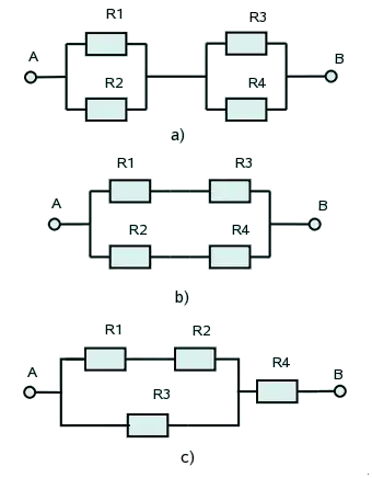 En una asociación mixta se encuentran conjuntos de resistencias en serie con conjuntos de resistencias en paralelo. En la figura 5 pueden observarse tres ejemplos de asociaciones mixtas con cuatro resistencias.