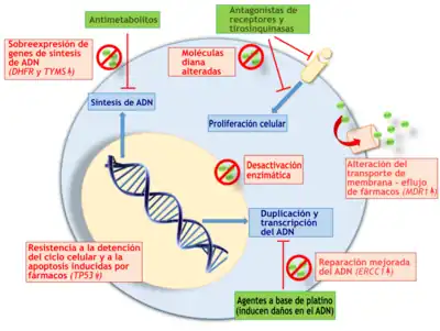 Las células cancerosas pueden volverse resistentes a múltiples fármacos mediante la alteración del transporte de membrana, la mejora de la reparación del ADN, los defectos de la vía apoptótica, la alteración de las moléculas diana, las proteínas y los mecanismos de la vía, como la desactivación enzimática.[12]