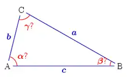 Se especifican las longitudes de los tres lados a, b, c. Para encontrar los ángulos α, β, puede ser utilizado el teorema del coseno:[3]