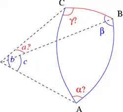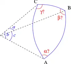 Conocidos: los lados a, b, c (en unidades angulares). Se calculan los ángulos del triángulo mediante el teorema del coseno (esférico):