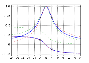 "Curva de resonancia universal", es una aproximación simétrica a la respuesta normalizada de un circuito resonante; La abscisa son desviaciones de la frecuencia central, en unidades de frecuencia central divididas por 2Q; ordenada es la amplitud relativa, y la fase en ciclos; las curvas discontinuas comparan el rango de respuestas de circuitos bipolares para un valor Q de 5; para Q más altos, hay menos desviación de la curva universal. las cruces marcan los bordes del ancho de banda de 3 dB(ganancia 0.707, cambio de fase 45° o 0.125 ciclo).