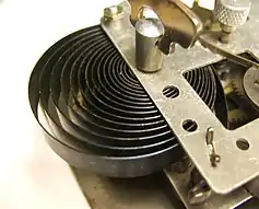 ![]() Resorte espiral del mecanismo de cuerda de un reloj despertador. |