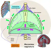 En los animales con pulmones, la respiración fisiológica implica ciclos respiratorios de respiraciones inhaladas y exhaladas. La inhalación suele ser un movimiento activo. La contracción del diafragma provoca una variación de presión, que es igual a las presiones causadas por los componentes elásticos, resistivos e inerciales del sistema respiratorio. En contraste, la exhalación suele ser un proceso pasivo. Inhalar, lleva aire a los pulmones, donde se produce el proceso de intercambio gaseoso entre el aire en los alvéolos y la sangre en los capilares pulmonares.