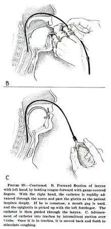 - Ventilación invasiva, en la se introduce un tubo en la tráquea del paciente (tubo endotraqueal) que se sella mediante un balón inflado con aire (neumotaponamiento). El tubo se puede introducir a través de la boca (intubación orotraqueal), a través de la nariz (nasotraqueal) o mediante una traqueotomía.