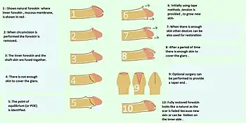 La restauración crea un facsímil del prepucio, aunque no es posible recuperar los tejidos especializados que fueron extraídos durante la circuncisión, en particular, la banda rugosa, una estructura inervada que rodea el pene a lo largo de la cúspide del prepucio, y que tiene entre otras funciones la de contraer la abertura alrededor del glande.[26][27] Existen procedimientos quirúrgicos para reducir el tamaño de la abertura una vez se ha completado la restauración (como se muestra en la imagen de arriba),[28] o puede aliviarse haciendo que el paciente mantenga por más tiempo el régimen de expansión de la piel para permitir así que se acumule más piel en la punta. La cicatriz de circuncisión se oculta a medida que la piel del pene empieza a plegarse, imitando tanto la función natural como la apariencia del prepucio.