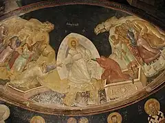 Entre los siglos VI y IX, la iconografía de la Resurrección en la Iglesia oriental se vio influenciada por la iconografía de la Transfiguración, dado que no existía una guía bíblica para la representación de la escena de la Resurrección.[14] En la iconografía ortodoxa tradicional el momento real de la Resurrección de Cristo ("Anábasis") nunca se representa, a diferencia del tratamiento de la resurrección de Lázaro. Los iconos no representan el momento de la Resurrección, sino que muestran a las portadoras de mirra, o el Descenso de Cristo a los infiernos.[15] Normalmente el Cristo resucitado está rescatando a Adán y Eva, y a menudo a otras figuras, simbolizando la salvación de la humanidad.[16] Su postura suele ser muy activa, en paralelo a las representaciones occidentales que lo muestran saliendo de la tumba.