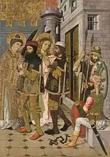 El pasaje de este milagro ya había sido tratado en el Retablo de San Esteban del monasterio de Santa María de Gualter (Noguera), obra del 1385 de Jaume Serra que también se encuentra expuesto en el MNAC, representa, en una única escena, la liberación de Galceran por intercesión del santo —una vez rotas las cadenas—, y el beneficio derivado que supuso el no tener que entregar las cien doncellas, que en esta pintura asisten maravilladas al milagro. Esta imagen se centra en el personaje de Galceran y san Esteban, no recogiendo la presencia del caballero de Santcerní ni de san Genís.[24]
