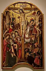 La tabla que ocupaba el cenit del retablo, en la calle central por encima de una supuesta talla de san Esteban, era el Calvario. En los retablos del siglo XV y, muy especialmente los de Jaume Huguet y la familia Vergós, esta tabla ocupaba siempre el ático de la calle central. La composición guarda muchas similitudes con el Calvario del desaparecido Retablo de San Antonio Abad de Huguet. Al pie de la Cruz, a la izquierda de la escena, las figuras de las tres Marías, más la Virgen sujetada por San Juan Evangelista. Detrás de este grupo, un soldado acerca la esponja con hiel a Jesús y aún más atrás, se ve, montado a caballo, a Longino con la lanza, el soldado arrepentido que se convertiría, ya se muestra en actitud orante ante Jesús. Una filacteria recuerda su frase vere homo hic Filius Dei erat (Verdaderamente este hombre era Hijo de Dios).Mc 15:39 Al lado derecho de la composición hay en primer plano un grupo de tres soldados jugando a dados y detrás de ellos, uno de los príncipes de los sacerdotes, que se describen en tres de los evangelios canónicos, increpando a Jesús crucificado. Una imagen que se encuentra en otras pinturas de Joan Mates, Bernat Martorell y el mismo Huguet.[25] Los personajes visten ropas ricas y contemporáneas de la época de la pintura. El cielo es dorado.