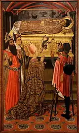 Cuatrocientos cien años más tarde, Gamaliel se apareció a un sacerdote llamado Luciano de Cafargamala, quien vivía cerca de Jerusalén y le contó el lugar donde podía encontrar el cuerpo de san Esteban y cómo identificar mismo. Encontraría dos vasos de or con rosas rojas junto al santo, dos vasos de oro con rosas blancas junto a Gamaliel y Nicodemo y un vaso de plata junto a Abbi. Tras sucesivas apariciones, Luciano se dirigió al obispo Juan de Jerusalén. Fueron en comitiva hasta el lugar de la sepultura en Cafargamala donde encontraron e identificaron cada uno de los cuerpos. La imagen recoge el momento del descubrimiento por parte del obispo. Las vestimentas y los objetos litúrgicos son contemporáneos del siglo XV y propios de una procesión pontifical de la época. El santo, en primer plano, con nimbo y en un estado absolutamente incorrupto a pesar de haber pasado 300 años, tiene a sus pies las rosas rojas descritas por Gamaliel.[21]