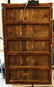 En cuanto al trabajo de carpintería, obviamente ha perdido la estructura que conformaba el cuerpo del retablo. El soporte de madera de cada una de las tablas lo forman tres o cuatro tablones verticales de más de un centímetro de grosor, enmarcados y con maderas traveseras que unen los laterales del marco evitando que este se abra, al mismo tiempo que sujeta las tablas por varios puntos.