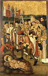 El grupo de tablas centrales representan seis escenas relacionadas con san Esteban, las cuales, como también se puede ver en retablos dedicados al mismo santo, representaban en imágenes los escritos más importantes o más en boga sobre el santo.[15] A finales del siglo XV se acostumbraba a mezclar episodios inspirados en los textos canónicos de las Sagradas Escrituras, vinculados a la doctrina tradicional y oficial de la Iglesia, junto con creaciones imaginativas y espontáneas de la literatura devota, con formas narrativas y contenidos de amplio consumo popular.