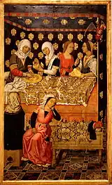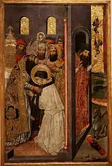Cabría, sin embargo, otra interpretación, si se considera la figura del obispo como una simbología de un «prelado judío» versionado para los observadores del siglo XV, al igual que los ambientes y las vestimentas son contemporáneas y no contextualizadas al momento que representan. La figura del obispo para representar a un sacerdote judío ya había sido empleada por Huguet en la tabla del Calvario de los retablos de San Miguel del gremio de los Tenderos y el de los santos Abdón y Senén. Una imagen que se encuentra en otros pinturas de Lluís Borrassà, Joan Mates y Bernat Martorell.[18]