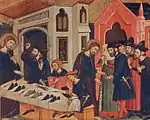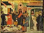 - A la izquierda, la escena se sitúa en el taller del zapatero Aniano situado en la calle -un hecho habitual en la Edad Media- en el barrio de Racotis de Alejandría. A Marcos se le había roto la sandalia y se acercó al taller del zapatero para que la repararan. Cuando Aniano se dispone a arreglarla, se pincha con una lezna y exclama un grito: "«Dios es el único!»" (Heis lo Theos).[16] Marcos, cogiendo un poco de barro que le aplica sobre la herida, procede a curarlo milagrosamente mientras le cuenta la historia de la figura de Jesús y su sacrificio por toda la humanidad.[17]