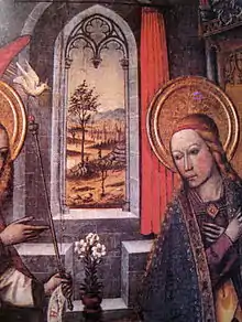 Al fondo de la pintura, se observa una ventana gótica con cortejador, muestra un paisaje que aparentemente es la ciudad de Barcelona que se configura ante el monte Carmelo, tal como aparece en la vista del siglo XVI, conservada en el Archivo Histórico de la Ciudad de Barcelona, y en otros posteriores. Esta vista, tomada de la vertiente de Montjuïc, ofrece en primer término el camino zigzagueante que bajaba de la montaña.[7][8] En la pared del lado izquierdo del observador hay un óculo en la parte alta que forma parte del simbolismo de la escena. El pavimento, con unas baldosas que ayudan a construir la perspectiva, muestra temas habituales en la cerámica valenciana del momento.[9]