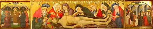 En esta restauración se eliminaron las tablas que se habían añadido en el siglo XIX, se recuperaron las dos tablas de los extremos de la predela original y, para ocupar el espacio central vacío, se optó por una tabla alargada obra de Lluis Borrassà. Esta pieza sólo es catorce años más moderna que el retablo original y su temática encaja dentro del relato iconográfico del retablo. Representa el Lamento sobre Cristo muerto y contrasta con el resto del retablo porque muestra un gran dramatismo. La escena del entierro presenta la cara deformada por el dolor de Cristo muerto y la tristeza de quienes lo velan.[8]