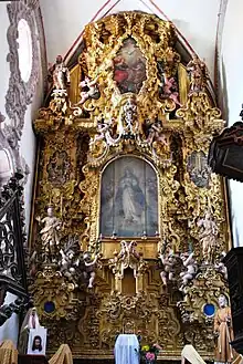 Los retablos de estilo anástilo juegan en su mayoría con un mismo patrón: carecen de soportes desdibujándose su estructura y primando la ornamentación. Su resaltada parte central está flanqueada por estípites que han perdido su cuerpo y entidad para albergar unas esculturas, desempeñando la función de nichos. La tendencia ascensional del retablo queda remarcada en la calle central acrecentada por las esculturas sobre peanas de las calles laterales. Se le considera uno de los retablos más originales de la última etapa del barroco al perder los soportes su función para cobijar las esculturas que refuerzan el movimiento ascendente de la obra.[4]