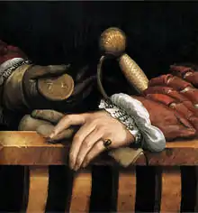 Sobre una mesa detrás de este se encuentran las piezas de una armadura brillante y una maza, símbolos alusivos a su naturaleza guerrera. Más allá de un muro liso, a la derecha, se abre una vista de un árbol frondoso, elemento placentero y decorativo, con las hojas perfiladas con gran habilidad. Esta vegetación es tan frondosa que cubre el espacio, asumiendo una función de variación de color del ambiente cerrado.