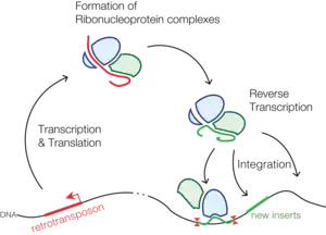 El intermedio de transposición de ARN se mueve desde el núcleo al citoplasma para la traducción. Esto proporciona las dos regiones de codificación de un LINE que a su vez se une al ARN del que se transcribe. Luego, el ARN LINE vuelve al núcleo para insertarse en el genoma eucariota.