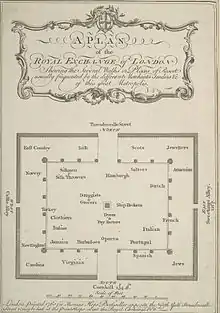 Las bolsas se desarrollaron a medida que aumentaba el volumen de las transacciones de valores. El London Royal Exchange establecido en 1565 se desarrolló primero como mercado de valores, aunque en 1801 se había convertido en una bolsa de valores.[34] El historiador Fernand Braudel sugiere que el Cairo, en el siglo XI, los comerciantes musulmanes y judíos ya habían establecido toda forma de asociación comercial y tenían conocimiento de todos los métodos de crédito y pago, refutando la creencia de que fueron inventados más tarde por italianos. En la Francia del siglo XII los cortesanos de cambio se ocuparon de la gestión y regulación de las deudas de las comunidades agrícolas en nombre de los bancos. Porque estos hombres también negociaban con deudas, podrían ser nombrados los primeros «corredores». A finales del siglo XIII, los comerciantes de mercancías de Brujas se reunieron en la casa de un hombre nombrado Van der Beurse, y en 1309 se convirtió en la «Brujas Beurse» institucionalizado lo que había sido, hasta entonces, una reunión informal. La idea se extendió rápidamente alrededor de Flandes y los condados vecinos y «Beurzen» pronto se abrió a Gante y Ámsterdam.[37]