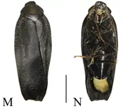 Mide 35,5 milímetros de longitud.[1] La hembra es ligeramente más grande que el macho con el cuerpo marrón oscuro (más que el macho); frente oscura y tarso y pretarso amarillentos.[1]