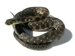 Rhabdophis tigrinus es una especie de serpiente venenosa de la familia Colubridae, subfamilia Natricinae.[2] Esta especie tiene un tamaño promedio de alrededor de 1 metro, frecuenta zonas de humedales del este de Asia y Rusia. Se alimenta principalmente de anfibios a los que neutraliza con su veneno. Es una especie potencialmente peligrosa para los humanos debido a que la acción de su veneno puede ser mortal, y a su carácter ponzoñoso. De hecho, es capaz de almacenar las toxinas contenidas en los sapos que constituyen su dieta y liberarlas como defensa contra los depredadores. Esta habilidad convierte a R. tigrinus en la única especie animal conocida que es a la vez venenosa y ponzoñosa.[3]