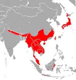 Se encuentra en China, India, Indonesia, Laos, Malasia, Birmania, Nepal, Tailandia y Vietnam.