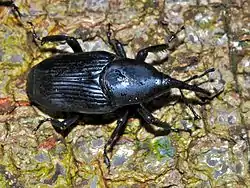 Es de coloración negra metálica u opaca,[1] a veces con visos rojizos; tiene surcos en los élitros. Adulto mide entre 26,6 y 53,3 mm de longitud y presenta dimorfismo sexual en las dimensiones de la prolongación de la probóscide o rostro, que en la hembra es larga, delgada y curvada y en el macho es de menor longitud, gruesa con una ligera curvatura distal.[3]