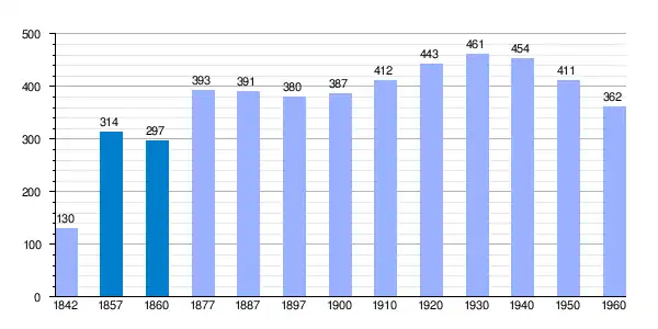 | Gráfica de evolución demográfica de La Riba de Santiuste[3] entre 1842 y 1960 |