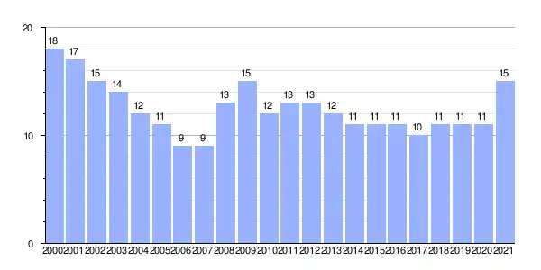 | Gráfica de evolución demográfica de Riba de Santiuste[5] entre 2000 y 2021 |