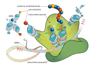 Los ribosomas son responsables de la síntesis de proteínas,[3] en un proceso conocido como traducción. La información necesaria para esa síntesis se encuentra en el ARN mensajero (ARN), cuya secuencia de nucleótidos, determina la secuencia de aminoácidos de la proteína. A su vez, la secuencia del ARN proviene de la transcripción de un gen que se encuentra en el ADN. El ARN de transferencia lleva los aminoácidos a los ribosomas donde se incorporan al polipéptido en crecimiento.