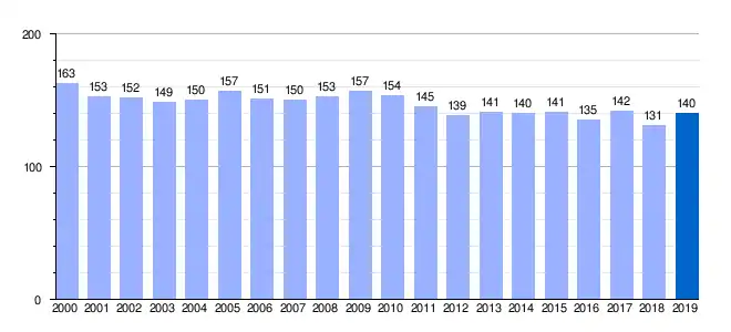 | Gráfica de evolución demográfica de Ricobayo[18] entre 2000 y 2019 |