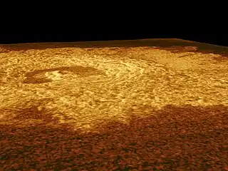 ![]() Este mosaico de radar de resolución completa de Magallanes centrado en 14 grados de latitud norte, 72 grados de longitud este, muestra una vista oblicua del cráter de impacto Riley. Esta vista se preparó a partir de dos imágenes de radar de la sonda Magallanes orientadas hacia la izquierda adquiridas con diferentes ángulos de incidencia. Debido a que los desplazamientos del relieve de las dos imágenes son diferentes, se pueden medir las profundidades desde el borde del cráter hasta el suelo del cráter y las alturas del borde y los flancos del cráter sobre las llanuras circundantes. El cráter tiene 25 kilómetros (15,5 millas) de diámetro. El suelo del cráter está a 580 metros (1.914 pies) por debajo de las llanuras que lo rodean. El borde del cráter se eleva 620 metros (2046 pies) sobre las llanuras y 1200 metros (3960 pies) sobre el suelo del cráter. El pico central del cráter tiene 536 metros (1.769 pies) de altura. El diámetro del cráter es 40 veces la profundidad, lo que da como resultado una apariencia relativamente poco profunda. La topografía se exagera 22 veces para enfatizar las características del cráter. | ||