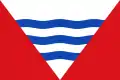 «Bandera Municipal:Bandera rectangular de proporciones 2:3; formada por un triángulo que tiene sus vértices en los puntos superiores del asta y del batiente y en el punto medio de la parte inferior, siendo blanco, con tres franjas en horizontal ondadas y azules de 1/10 del ancho de la bandera, siendo los triángulos del asta y del batiente rojos.»Boletín Oficial de Castilla y León nº40 de 27 de febrero de 2003[2]