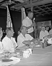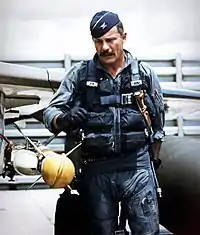 ![]() El coronel Robin Olds con su característico bigote, conduciendo una misión de precombate caminando alrededor de la inspección de su caza F-4, en Ubon RTAFB, Tailandia, alrededor de septiembre de 1967. | ||