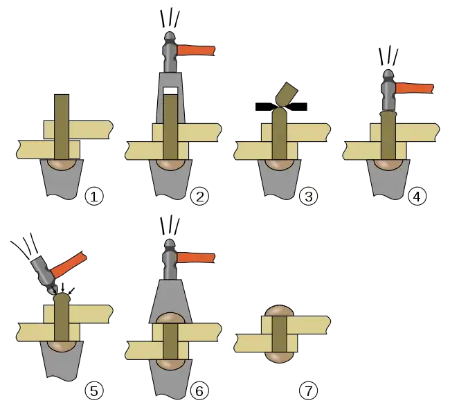 - 1. Montaje preliminar. se montan las dos piezas a unir y se hace pasar el roblón sólido a través del hueco. Se debe tener en cuenta que el agujero debe ser ligeramente mayor que el roblón (no debe haber ajuste).