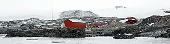 Vista de las rocas en la caleta Choza (a la izquierda de la punta Foca), junto con la Base Esperanza y la Estación R. Elichiribehety.