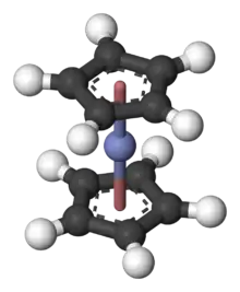 El ferroceno, [Fe(C5H5)2], fue sintetizado por primera vez en 1951 durante un intento de preparar el biciclopentadienilo (C10H8) por acoplamiento oxidativo del ciclopentadieno; el producto resultante tenía la fórmula molecular C10H10Fe y exhibía una «notable estabilidad».[10] El descubrimiento despertó un renovado interés en el campo de la química organometálica,[8][9] en parte debido a la estructura propuesta por Pauson y Kealy (que se muestra a la derecha) era incompatible con los modelos existentes de enlace y no explicaba su inesperada estabilidad. En consecuencia, el desafío inicial fue determinar definitivamente la estructura del ferroceno con la esperanza de que sus propiedades y enlaces químicos fueran entendidos y se abriera el campo de una nueva familia de metalocenos. La estructura tipo «sándwich» fue deducida y publicada independientemente por tres grupos en 1952: Robert Burns Woodward y Geoffrey Wilkinson investigaron la reactividad a fin de determinar la estructura[27] y demostraron que el ferroceno sufre reacciones similares a una molécula aromática típica (como el benceno),[28] Ernst Otto Fischer no solo dedujo la estructura tipo «sándwich», sino que también comenzó a sintetizar otros metalocenos, incluyendo el cobaltoceno,[29] mientras que Eiland y Pepinsky confirmaron, mediante cristalografía de rayos X, la estructura del complejo.[30] La aplicación de la teoría del enlace de valencia al ferroceno considerando un centro metálico de Fe2+ y dos aniones de ciclopentadienilo (C5H5−), que se sabe que son aromáticos según la regla de Hückel y, por tanto, muy estables, permitió corregir la predicción de la geometría de la molécula. Sin embargo, fue solo después de aplicar la teoría de los orbitales moleculares correctamente cuando quedaron claras las causas de la notable estabilidad del ferroceno.[13]
