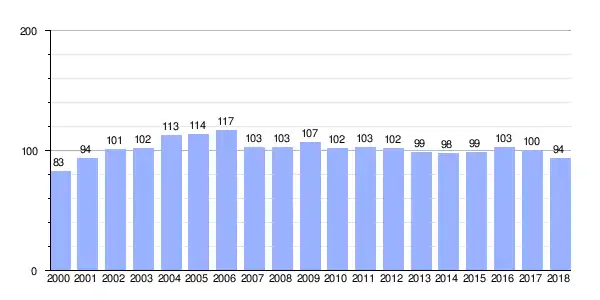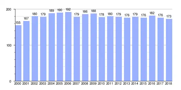 | Gráfica de evolución demográfica de Rois (parroquia) entre 2000 y 2018 |