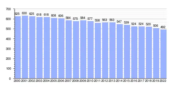 | Gráfica de evolución demográfica de Rois (parroquia) entre 2000 y 2022 |