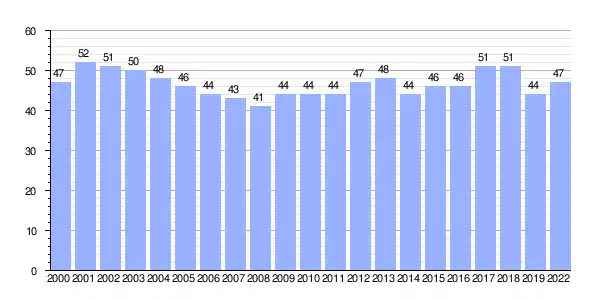 | Gráfica de evolución demográfica de Rois (aldea) entre 2000 y 2022 |