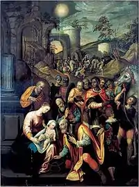 Adoración de los Reyes Magos, óleo sobre tabla, 288 x 214 cm, Museo de Zaragoza. Procedente de la capilla funeraria que el pintor tenía en el convento de Santo Domingo de Zaragoza.