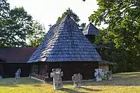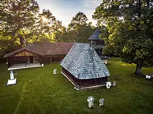 La iglesia es rectangular, cuatro metros de ancho y siete metros de largo. Está construido con gruesas tablas de roble. Se hicieron algunas rendijas entre los registros en el lugar de las ventanas. El piso de la iglesia está hecho de tierra compactada. La parte interior de la iglesia está dividida por el iconostasio en la parte del altar y el espacio de la nave. Se erigió un coro con escaleras a la entrada del templo. Las puertas imperiales están hechas de madera de pino, probablemente a principios del siglo XIX. Son obra de un artesano local desconocido, con varios nombres de colaboradores escritos en ellos.[7]