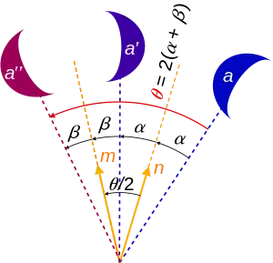 Una rotación en el plano se puede formar al componer un par de reflexiones. Primero, se calcula la reflexión de un punto P para obtener su imagen P′ al otro lado de la recta L1. A continuación, se calcula la reflexión de P′ para obtener su imagen P′′ al otro lado de la recta L2. Si las rectas L1 y L2 forman un ángulo θ entre sí, entonces los puntos P y P′′ formarán un ángulo de 2θ alrededor del punto O, intersección de L1 y L2. Es decir, el ángulo POP′′ medirá 2θ.[1]