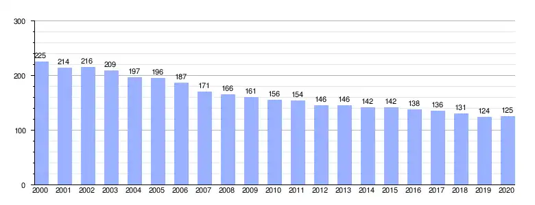 | Gráfica de evolución demográfica de Rozadas[2] entre 2000 y 2020 |