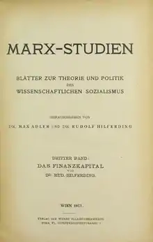 El capital financiero[50][51] de Hilferding (Das Finanzkapital, Viena: 1910) fue "el análisis marxista fundamental de la transformación del 'capitalismo liberal' competitivo y pluralista en 'capital financiero' monopolista",[52] y anticipó en gran medida escritos "derivados" sobre el tema de Lenin y Bujarin.[53] El libro fue una respuesta al revisionismo reformista de Eduard Bernstein dentro del austromarxismo, quien argumentó que el avance del capitalismo había atenuado sus contradicciones internas, surgiendo una nueva etapa de "capitalismo reformado". Hilferding por el contrario argumentó "que las contradicciones del capitalismo se estaban agudizando".[19]