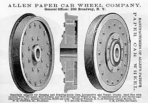 Las ruedas con interior de papel fueron inventadas por el ingeniero de locomotoras estadounidense Richard N. Allen (1827-1890),[4] quien estableció una compañía con su cuñado en 1867, produciendo papel a partir de la paja de los cereales.[5] Amortiguaban las vibraciones mucho mejor que las ruedas de ferrocarril de hierro fundido convencionales, que transmiten todas las imperfecciones de la vía al coche situado por encima, haciendo que los viajes en tren fuesen ruidosos e incómodos.[1] Fueron especialmente utilizadas en los coches comedor y en los coches cama de la compañía Pullman,[6][7] aunque ocasionalmente fueron criticadas por causar descarrilamientos. En 1915, la Comisión de Comercio Interestatal, que regulaba los ferrocarriles estadounidenses, declaró que las ruedas de papel no eran seguras, y dejaron de usarse en los vagones de ferrocarril de los Estados Unidos.[3]